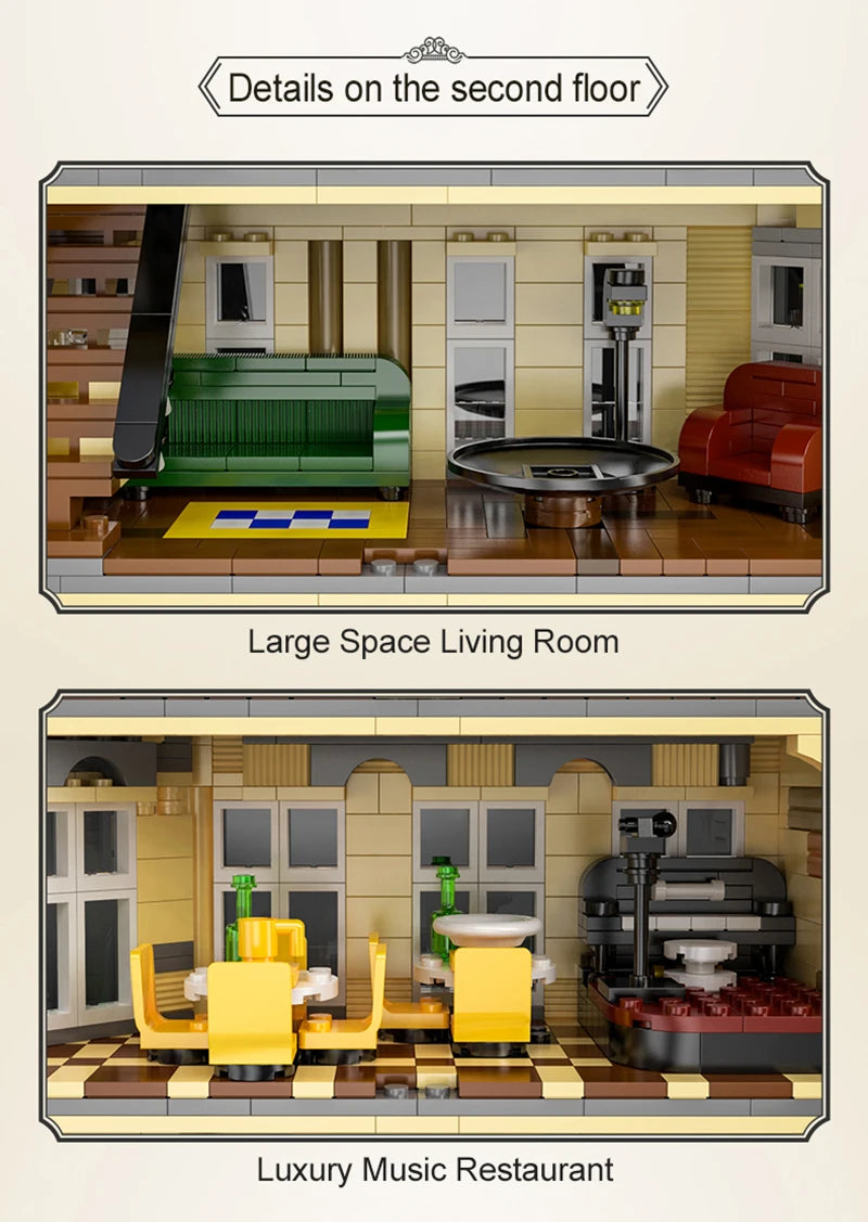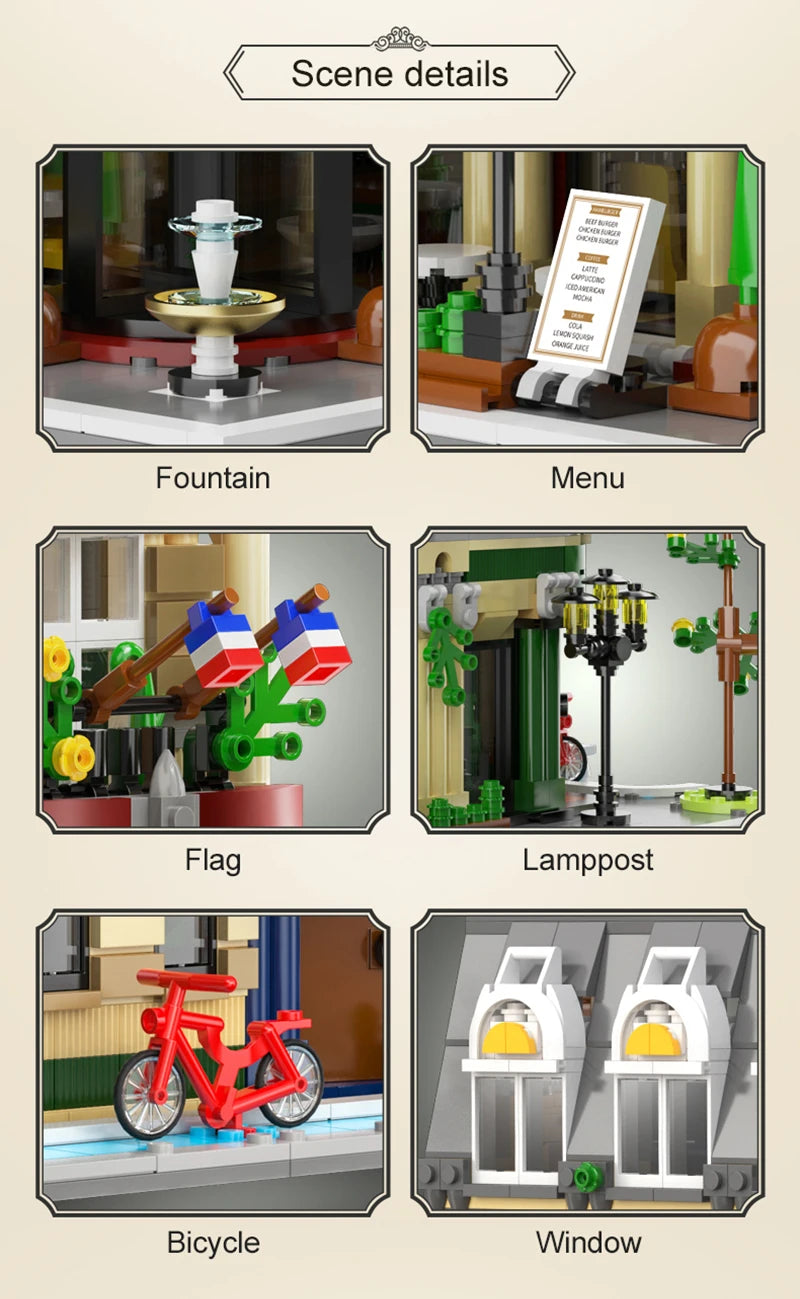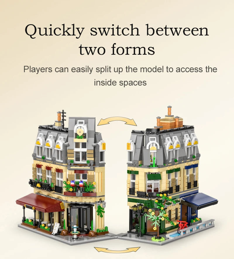 Offrez-vous un voyage architectural au cœur de Paris avec ce modèle à construire unique. Composé de 3230 pièces, ce bâtiment d’angle intègre un restaurant chic, un café-terrasse, une librairie et même un appartement luxueux sur les étages supérieurs. Grâce à sa conception modulaire, il se transforme en deux formes différentes pour exposer chaque recoin de ses intérieurs détaillés.
